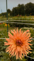 AC Ben is a striking dahlia variety known for its large, spiky blooms and dramatic color transitions. Each flower glows with a sunset-inspired blend of soft yellow and warm orange, shifting seamlessly through peach, coral, and buttery yellow tones.